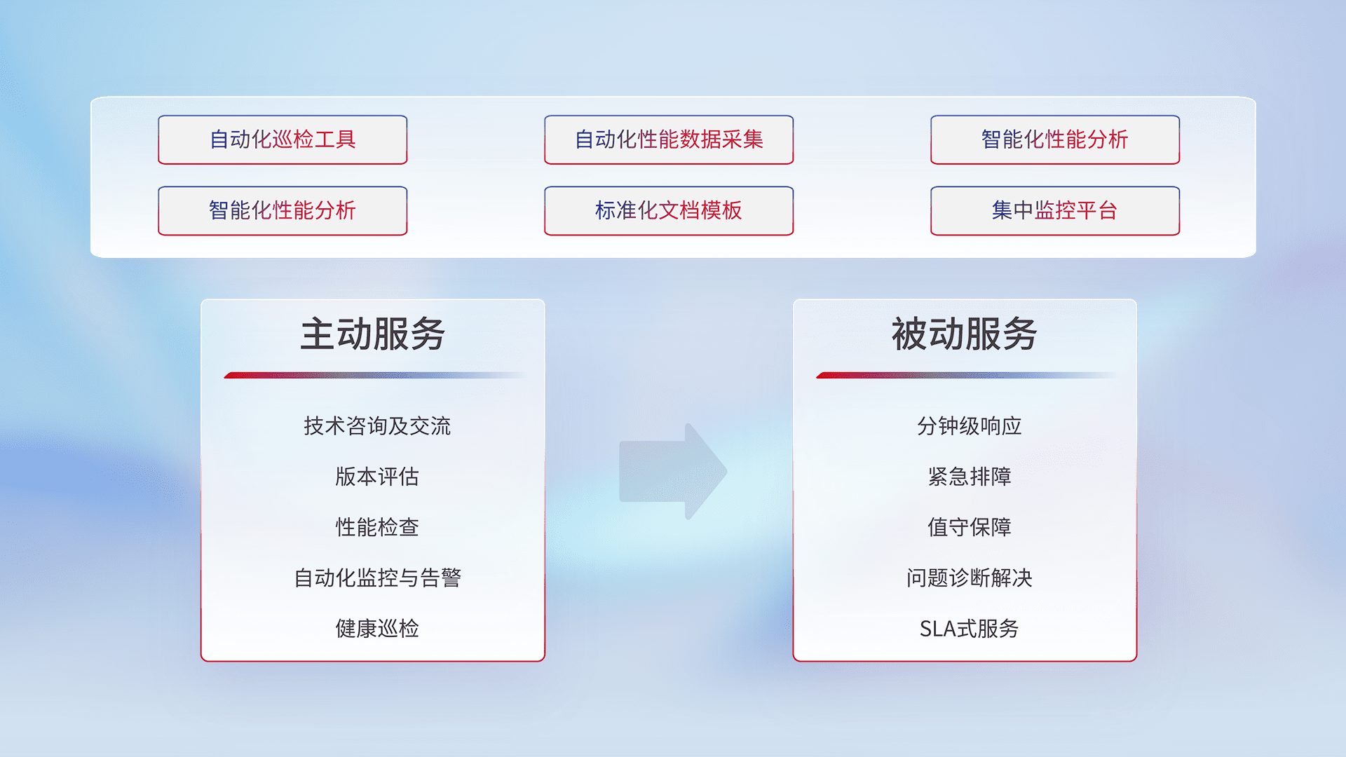 智能化工具和标准化文档,,保障服务质量,,提供主动服务(包含技术咨询、、版本评估、、性能检查、、、自动化监控与告警、、健康巡检)和被动服务包含(分钟级响应、、、、紧急排障、、、、值守保障、、、问题诊断解决、、、、SLA服务)。。。