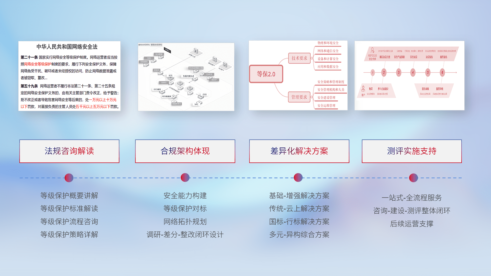 通过专业的法律咨询解读、、、、合规架构体现、、差异化解决方案、、、测试实施支持等服务,,,,为客户量身打造等保合规体系。。。