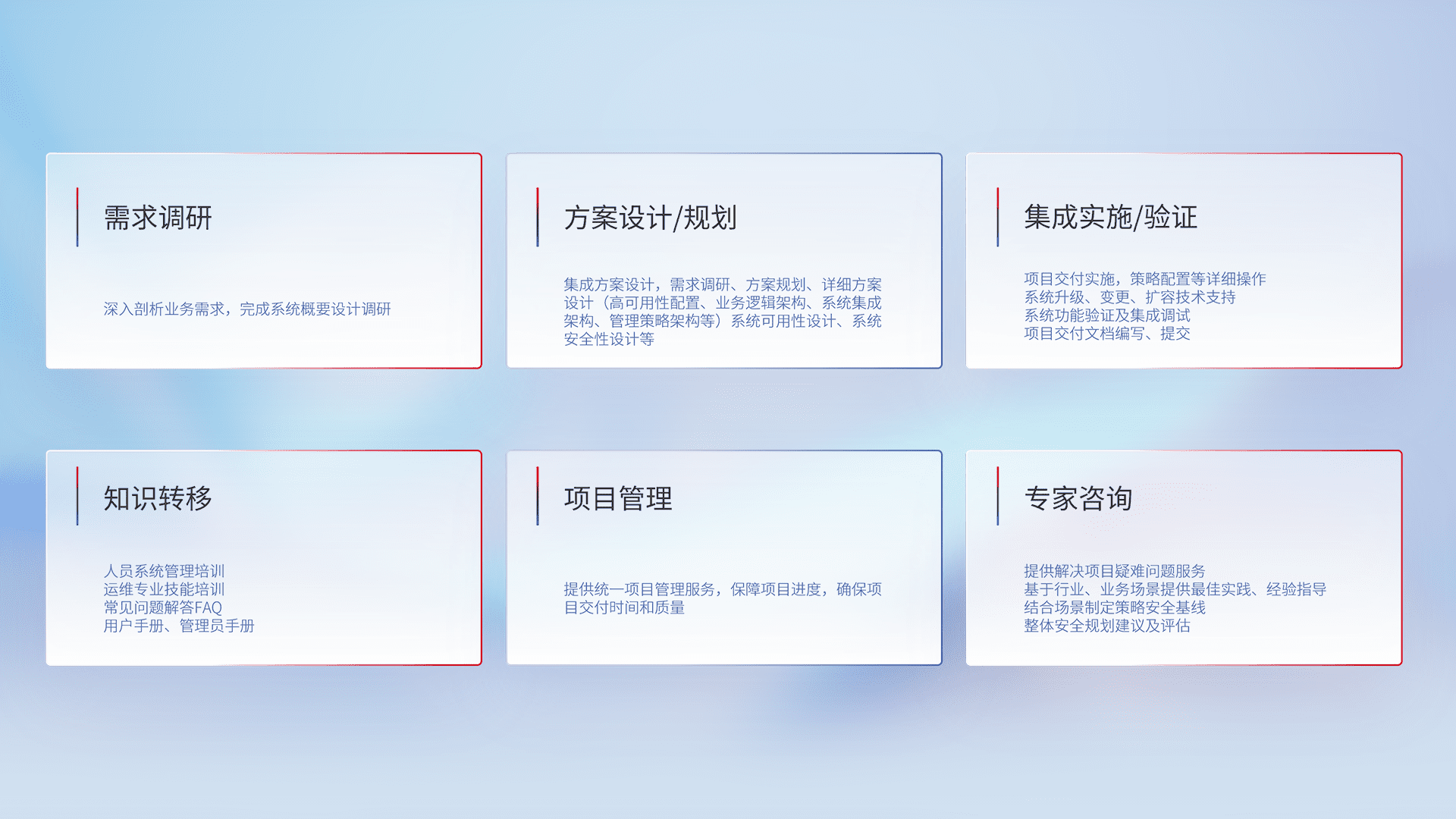 针对客户行业特性,,,,将宏观的安全战略和需求,,通过专业的交付服务,,,实现项目落地,,为客户提供标准规范的集成交付服务。。。。